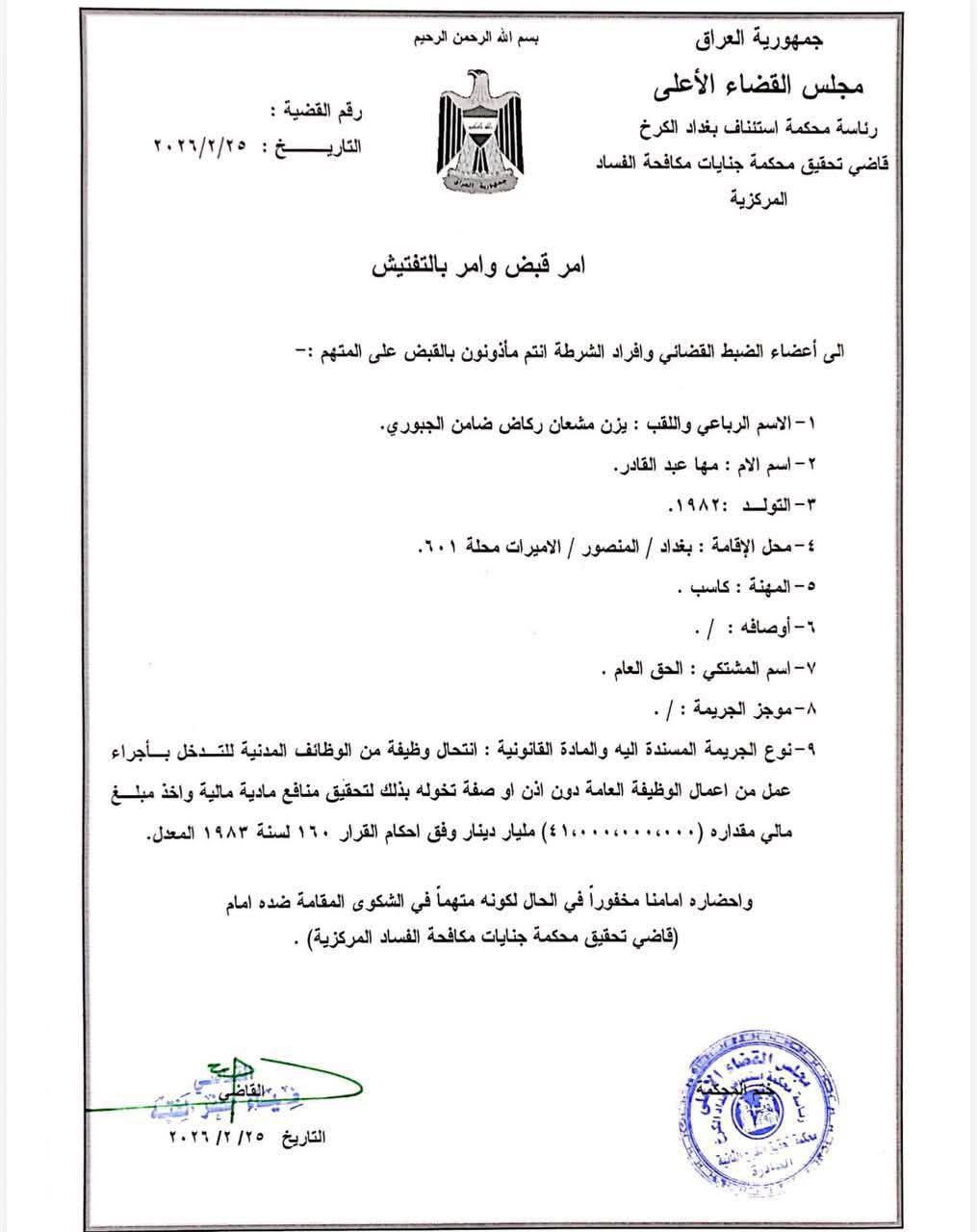 اعتقال يزن مشعان الجبوري بتهمة انتحال صفة والاستيلاء على 41 مليار دينار