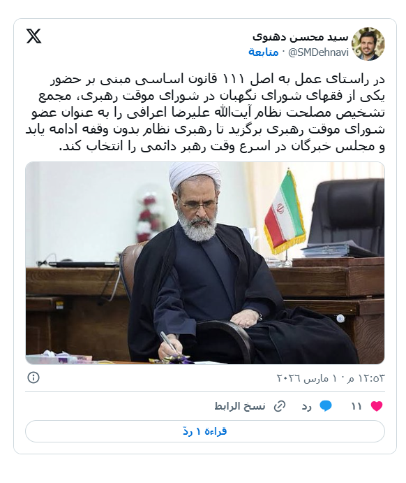 وقال في تدوينة عبر صفحته الرسمية بمنصة «إكس»، اليوم الأحد، إن القرار يتماشى مع المادة 111 من الدستور، التي تنص على وجوب اختيار أحد فقهاء مجلس صيانة الدستور في مجلس القيادة المؤقتة.