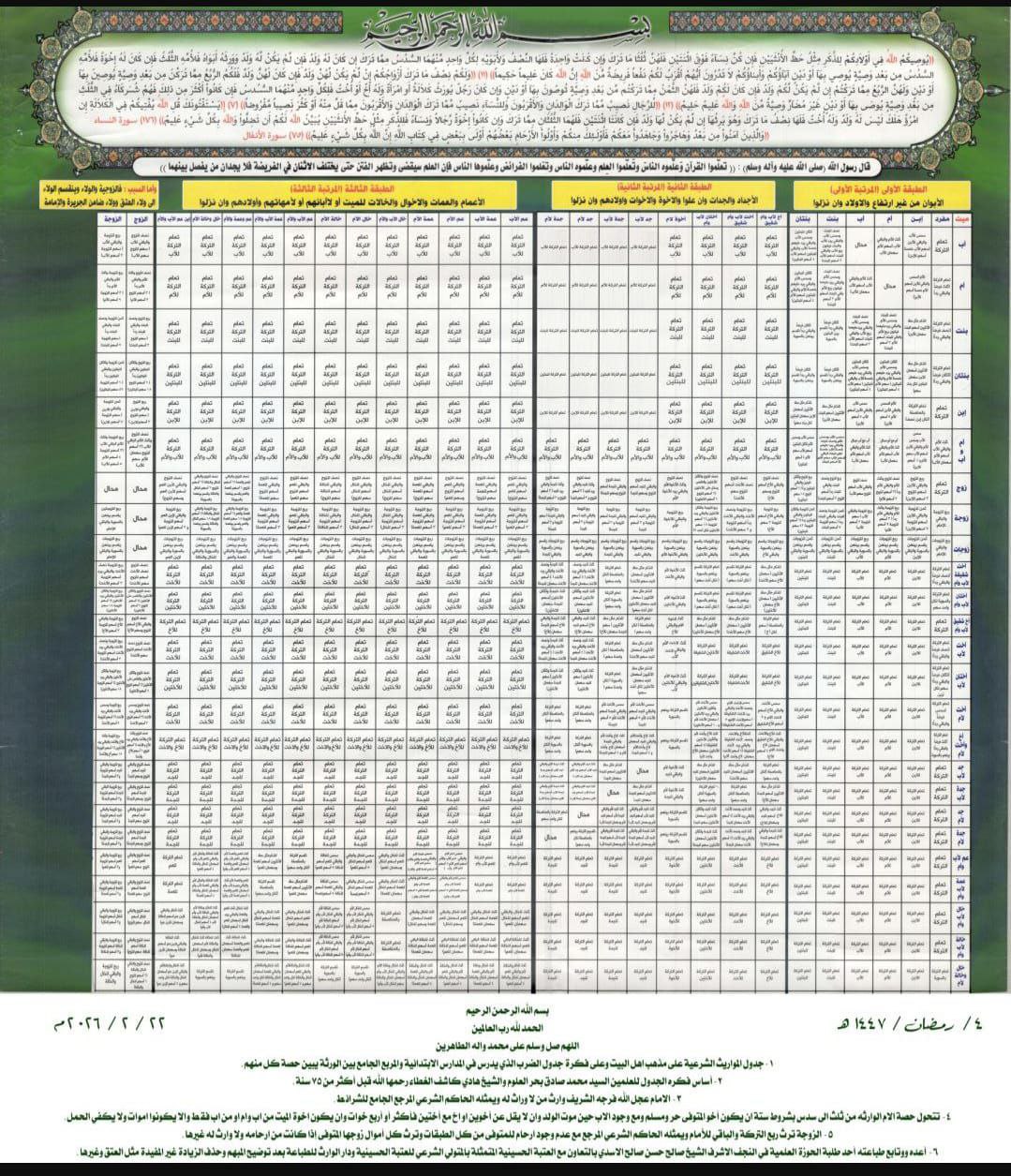واضاف "الاسدي" قائلا ان" هذا الجدول يمكن ان يستفيد منه رجال الدين في الرد الاسئلة الشرعية التي تخص المواريث، ويستفيد منها الخبراء وخاصة بعد ان اقرت مدونة القانون الجعفري، وكذلك يستفيد منها القضاة في المحاكم وزودت قضاة محاكم كربلاء المقدسة بنسخ منها وطلبوا مني كمية اكبر من المطبوعات، كما زودت نقابة المحامين فرع كربلاء المقدسة بشقيها النسوي والرجالي بنسخ من الجدول المطبوع، وايضا جهزت المدارس الدينية واقسام الشؤون الدينية في العتبتين المقدستين الحسينية والعباسية بنسخ منه، وهدفي منه نشر علوم محمـد وآل محمـد بشكل ميسر ومبسط، وهي طريقة ستغني تلك الشرائح عن البحث في بطون الكتب والاشكالات الواردة في المواريث لانه طريقة تشبه جدول الضرب وفيها حقول للورثة بشكل افقي وعمودي ومربع الالتقاء الجامع بين الخطين العمودي والافقي يحدد حصة كل وريث"، مشيرا الى ان" عامة الناس ممكن ان يفهوا المواريث من خلال الاعتماد على هذا الجدول بشكل بسيط، وناتج هذا الجدول جاء بعد عمليات تهذيب وجمع وحذف لان فيه امور لا توجد في زمننا الحالي وهي امور غير ابتلائية وتعتبر حشو مثل العتق، والإماء، والعبيد، وخلال لقائنا اليوم بالمتولي الشرعي للعتبة الحسينية المقدسة الشيخ "عبد المهدي الكربلائي"، أبدى اعجابه بالجدول واخذ نسخا منها ليؤطروها له ليضعها في المكتب لاهميتها، ومن الممكن اعادة طباعة كمية جديدة وتوزيعها لتعميم الفائدة".
