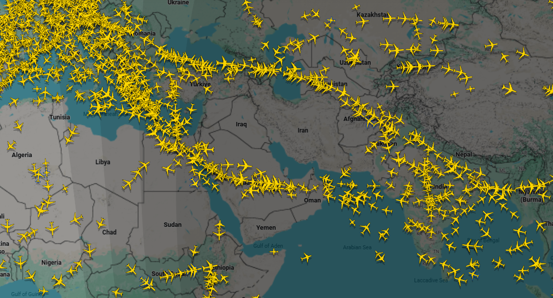 وتوضح الخريطة غياباً شبه كامل للطائرات المدنية فوق الأجواء الإيرانية والعراقية فضلاً عن دول الخليج وسوريا والاردن، في حين تتركز حركة الطيران بكثافة في المسارات المحيطة بالمنطقة، خصوصاً فوق تركيا وشرق البحر المتوسط وشبه القارة الهندية، إضافة إلى المسارات البحرية جنوب الخليج العربي.