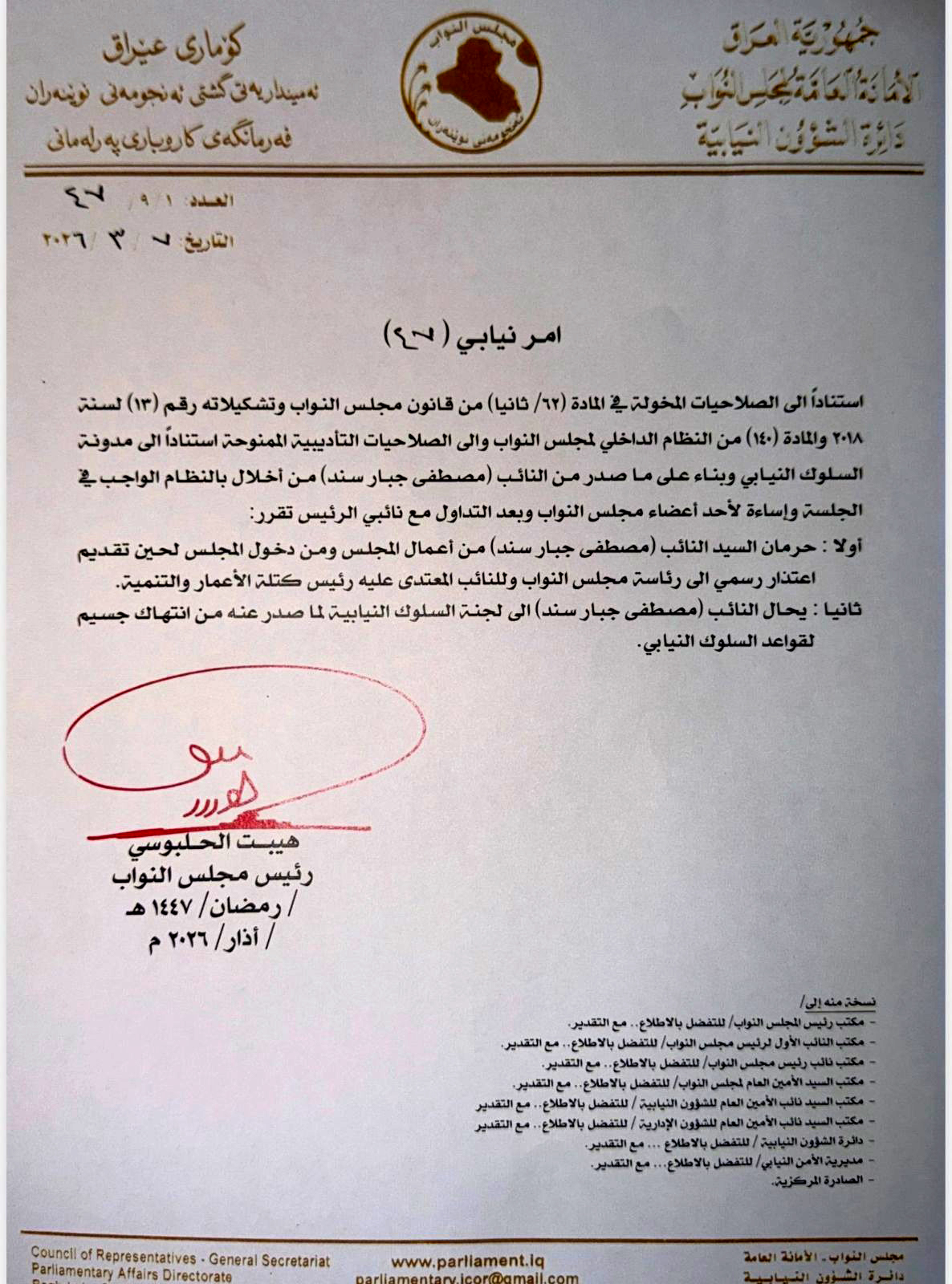 أمر رئيس مجلس النواب هيبت الحلبوسي، اليوم الأحد، بحرمان النائب مصطفى سند من الدخول إلى البرلمان، لحين الاعتذار من رئيس البرلمان ورئيس كتلة الإعمار والتنمية بهاء الأعرجي، وإحالته إلى لجنة السلوك النيابية لما صدر عنه من انتهاك جسيم لقواعد السلوك النيابي.