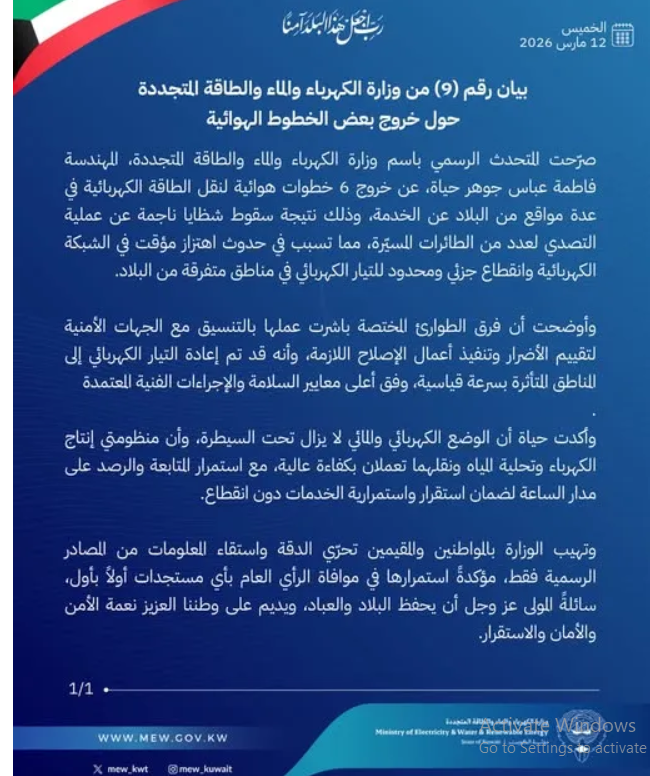 أعلنت وزارة الكهرباء الكويتية، اليوم الخميس، خروج 6 خطوط لنقل الكهرباء عن الخدمة نتيجة سقوط شظايا ناجمة عن التصدي لمسيرات.