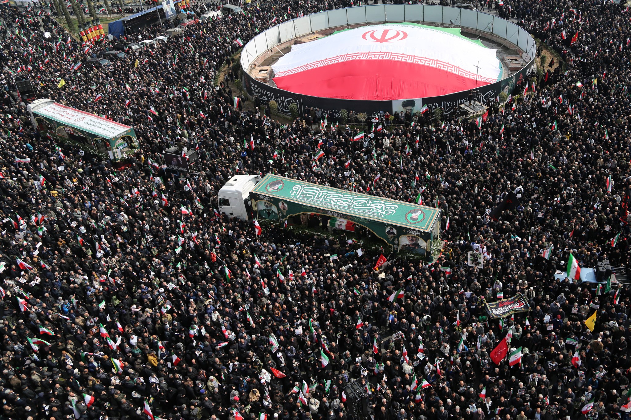 وهتف المشاركون في مراسم التشييع بشعارات مناهضة للولايات المتحدة وإسرائيل وبريطانيا.