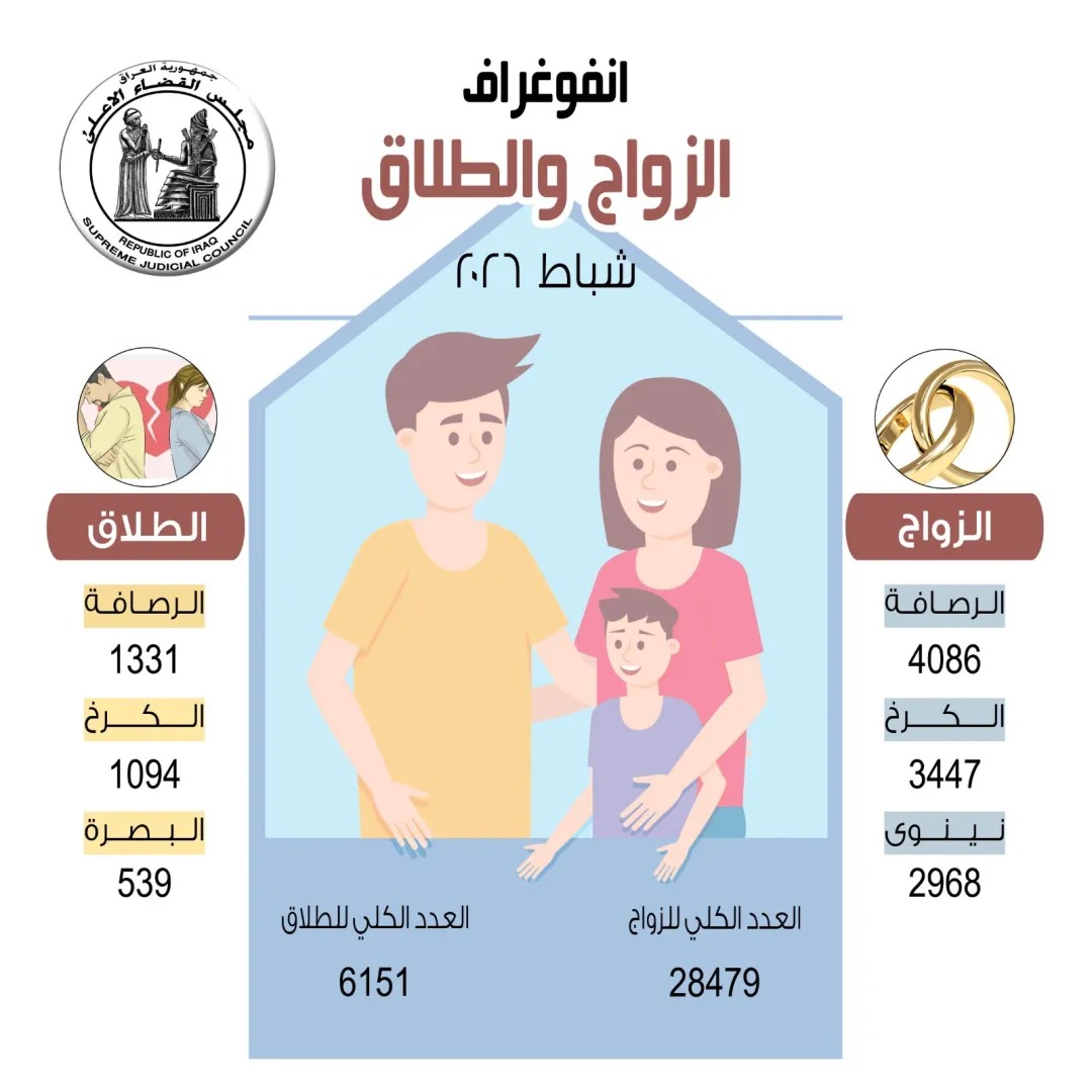 ووفقاً للبيانات الرسمية، بلغ إجمالي حالات الزواج 28,479 حالة. وتصدر جانب الرصافة في العاصمة بغداد القائمة بـ 4,086 حالة، يليه جانب الكرخ بـ 3,447 حالة، فيما حلت محافظة نينوى في المرتبة الثالثة بواقع 2,986 حالة زواج.