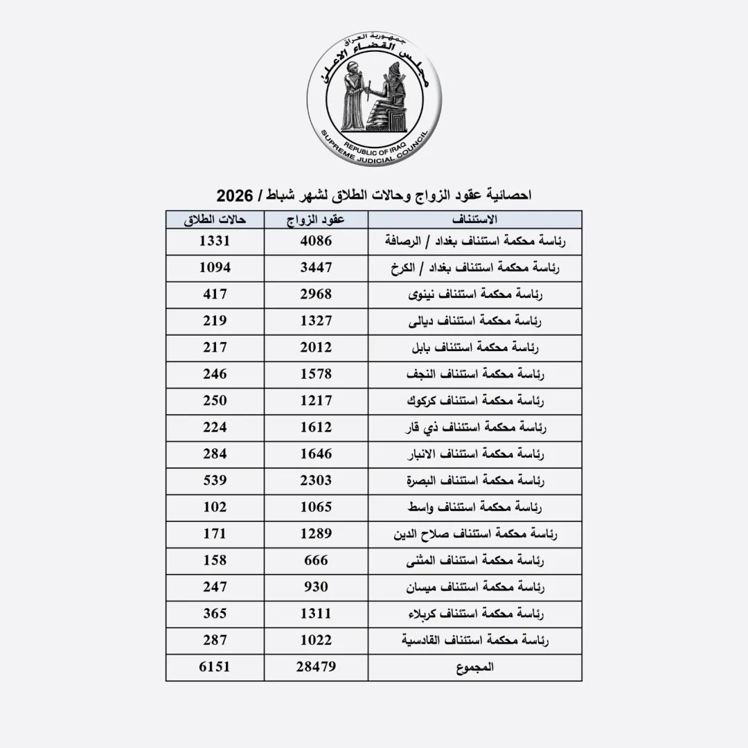 أعلن مجلس القضاء الأعلى، اليوم الأحد، عن إحصائية رسمية لحالات الزواج والطلاق في محافظات العراق (باستثناء إقليم كردستان) خلال شهر شباط الماضي، مشيراً إلى تسجيل نحو 30 ألف عقد زواج جديد.