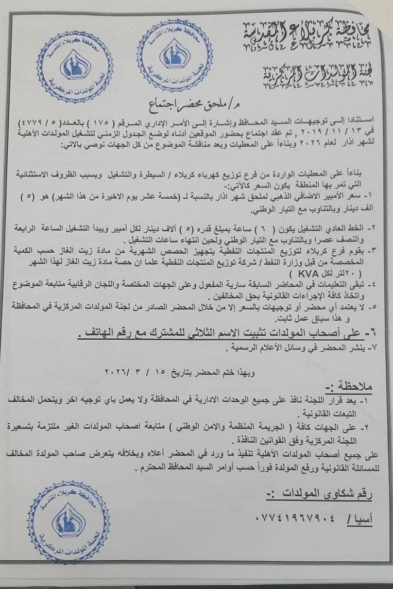 وحددت حكومة كربلاء المحلية أسعار أمبيرية المولدات الاهلية للخطين العادي والذهبي لشهر آذار 2026، بمبلغ 5000 دينار للخط العادي و7000 دينار للخط الذهبي.