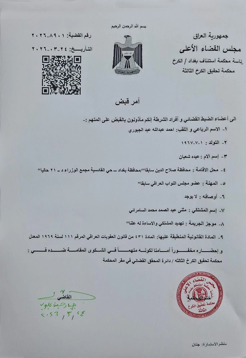 وتضمنت الوثيقة بيانات المتهم، مشيرة إلى أن مهنته "عضو مجلس النواب العراقي سابقاً"، مع توجيه الجهات المختصة بتنفيذ أمر القبض وإحضاره مخفوراً أصولياً كونه متهماً في الشكوى المقامة ضده.