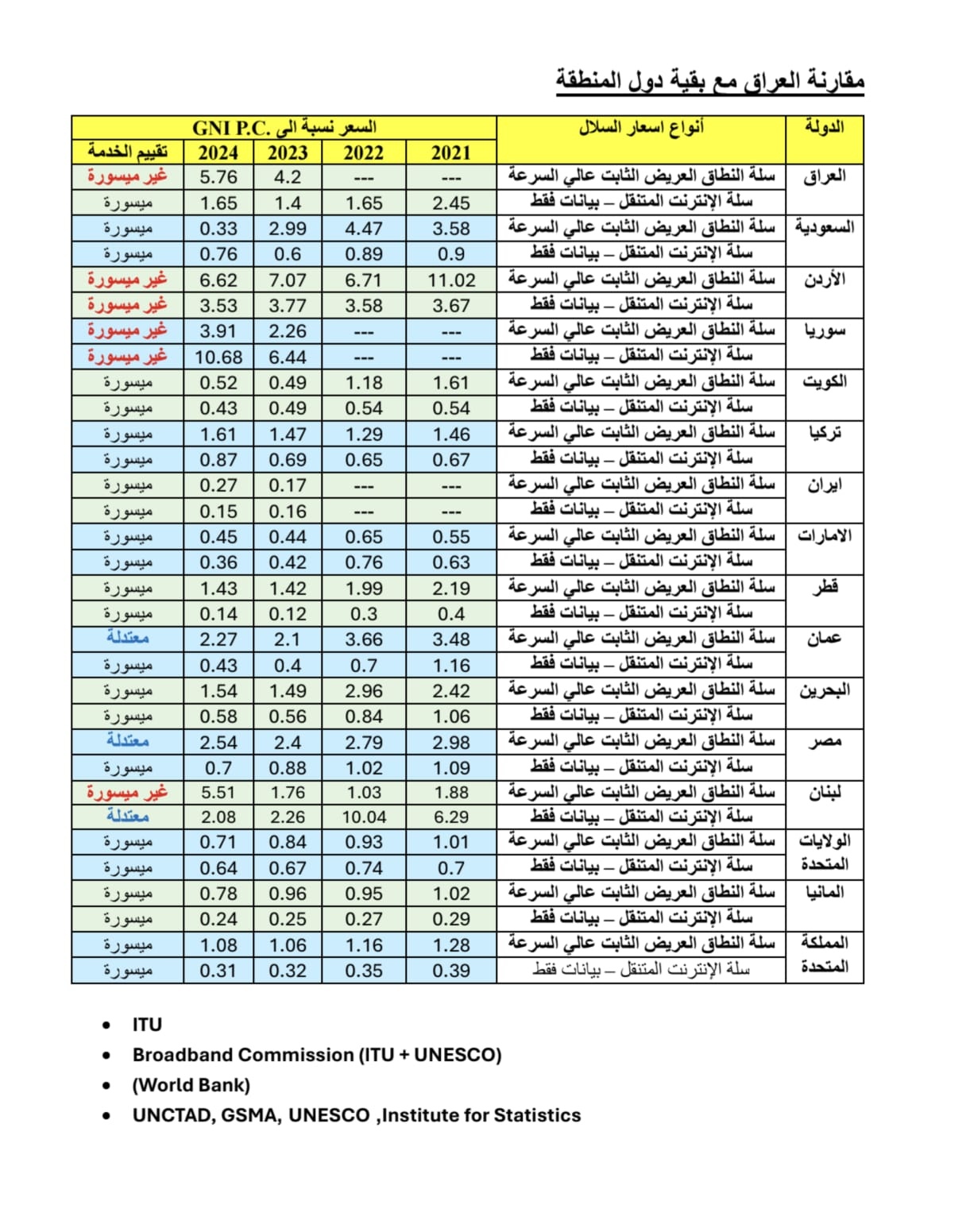 ويقول المهندس الاستشاري والخبير في الاتصالات رضا خضر الياس، إن أسعار الإنترنت الثابت في العراق تعد من الأعلى عالمياً، مبيناً أن فرض ضريبة إضافية بنسبة 20% سيؤدي إلى زيادة الأسعار بصورة أكبر، الأمر الذي سيُعيق مسار التنمية الرقمية ويعرقل جهود تحقيق الشمول الرقمي في البلاد.