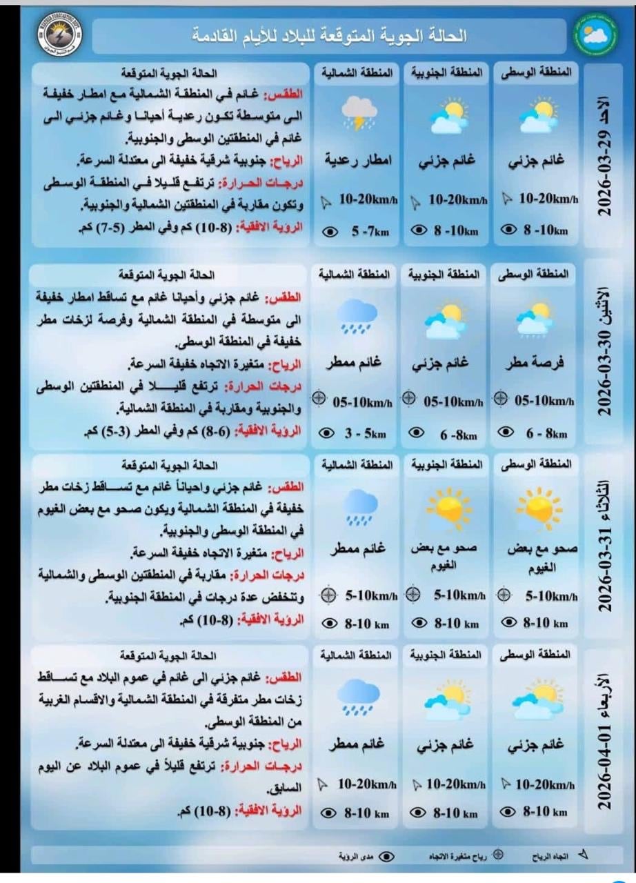 واضافت أن "طقس يوم الثلاثاء سيكون غائماً جزئياً وأحياناً غائم مع تساقط زخات مطر خفيفة في المنطقة الشمالية، ويكون صحواً مع بعض الغيوم في المنطقتين الوسطى والجنوبية، ودرجات الحرارة مقاربة في المنطقتين الوسطى والشمالية وتنخفض عدة درجات في المنطقة الجنوبية"، مشيراً إلى أن "طقس الأربعاء القادم سيكون غائماً جزئياً إلى غائم في عموم البلاد مع تساقط زخات مطر متفرقة في المنطقة الشمالية والأقسام الغربية من المنطقة الوسطى، ودرجات الحرارة ترتفع قليلاً في عموم البلاد عن اليوم السابق