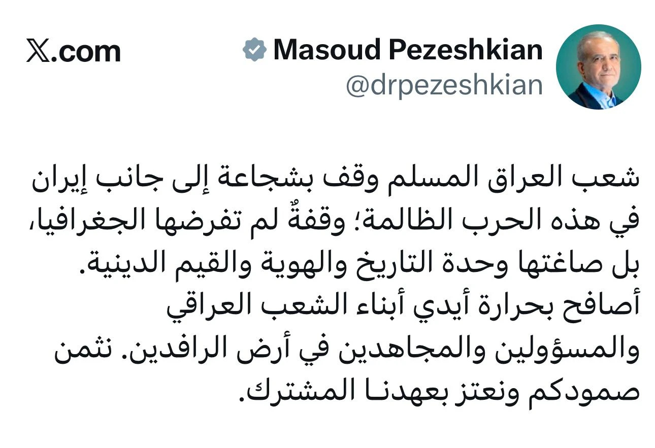 أشاد الرئيس الإيراني مسعود بزشكيان، اليوم الثلاثاء، بموقف الشعب العراقي المساند لبلاده في المواجهة العسكرية الحالية، واصفاً إياها بالـ"حرب الظالمة" التي تشنها الولايات المتحدة وإسرائيل.