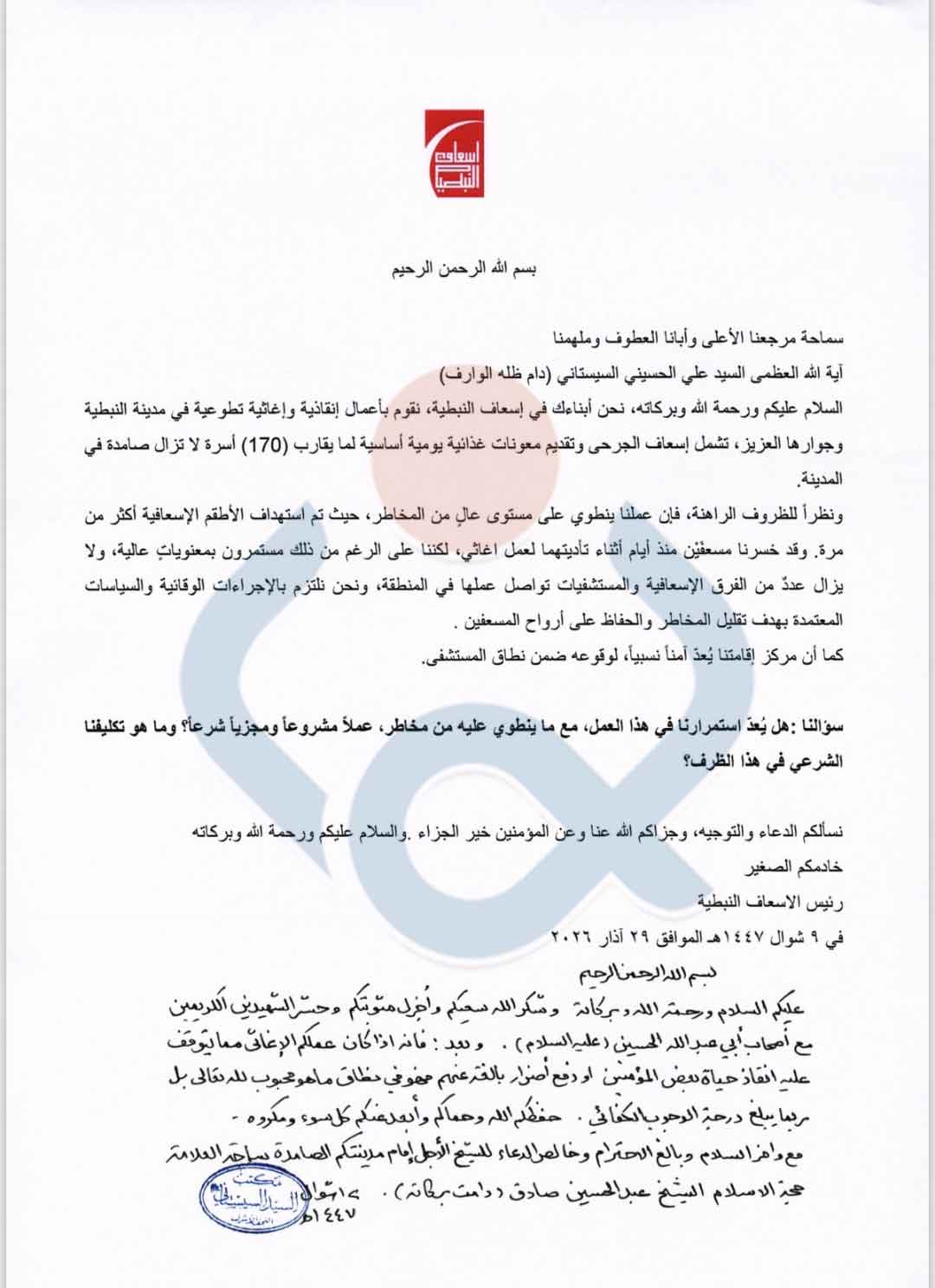وتنشر وكالة نون الخبرية نص رسالة المسعفين في النبطية للسيد السيستاني، والتي جاء فيها: انه نظراً للظروف الراهنة فان عملنا ينطوي على مستوى عالي من المخاطر حيث تم استهداف الاطقم الإسعافية أكثر من مرة، وقد خسنا مسعفين اثنين منذ أيام اثناء تأديتهما العمل الاغاثي، لكننا على الرغم من ذلك مستمرون بمعنويات عالية، ولا يزال عدد من الفرق الاغاثية والمستشفيات تواصل عملها في المنطقة ونحن نلتزم بالإجراءات الوقائية والسياسات المعتمدة بهدف تقليل المخاطر والحفاظ على أرواح المسعفين، كما ان مركز اقامتنا يعد امنا نسبيا لوقوعه ضمن نطاق المستشفى، سؤالنا: هل يعد استمرارنا في هذا العمل مع ما ينطوي عليه من مخاطر عملاً مشروعاً ومجزياً شرعا؟ وما هو تكليفنا الشرعي في هذا الظرف.