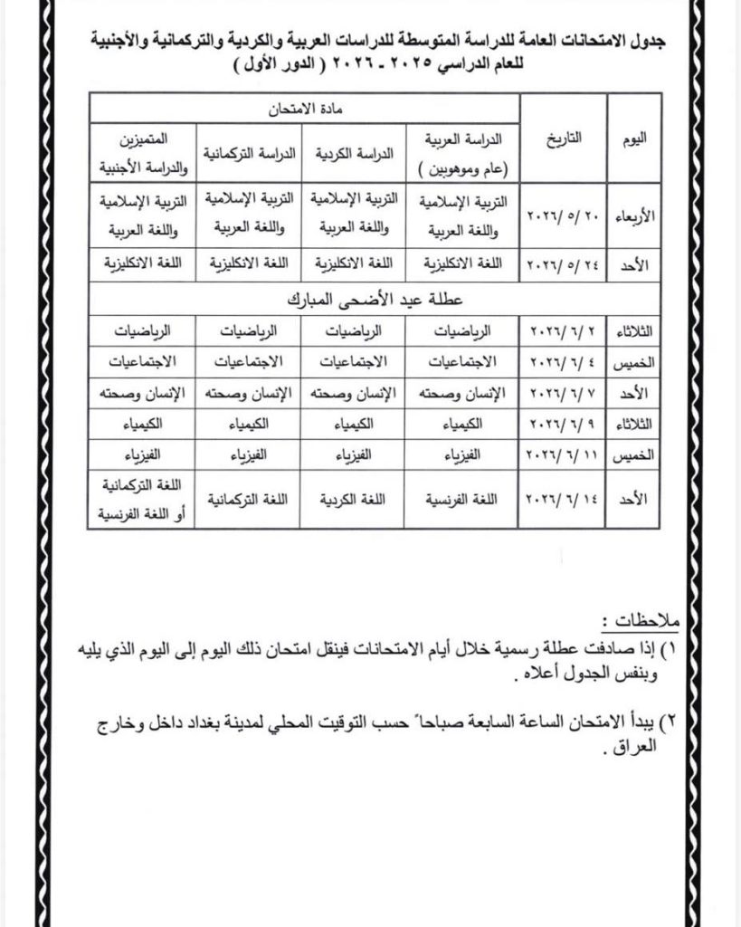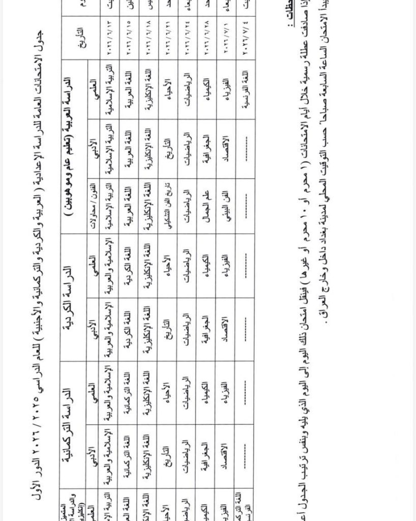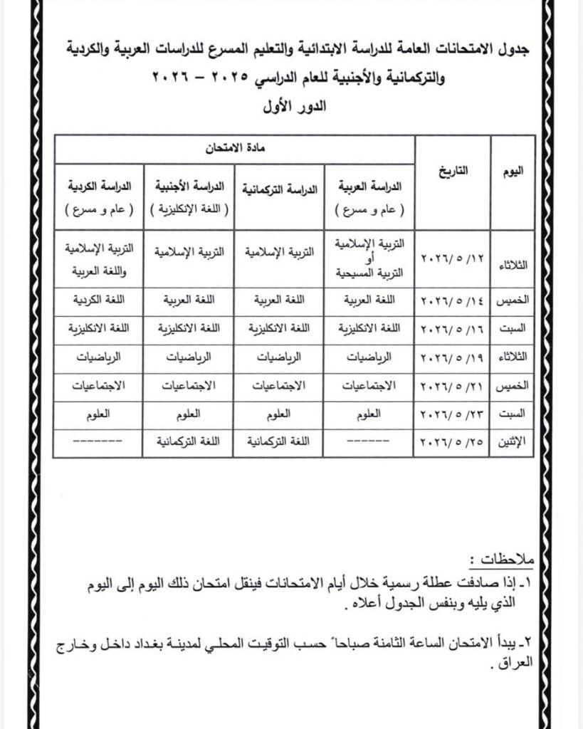 التربية تعلن جداول الامتحانات العامة للعام الدراسي 2025 – 2026 بعد تقديم المواعيد