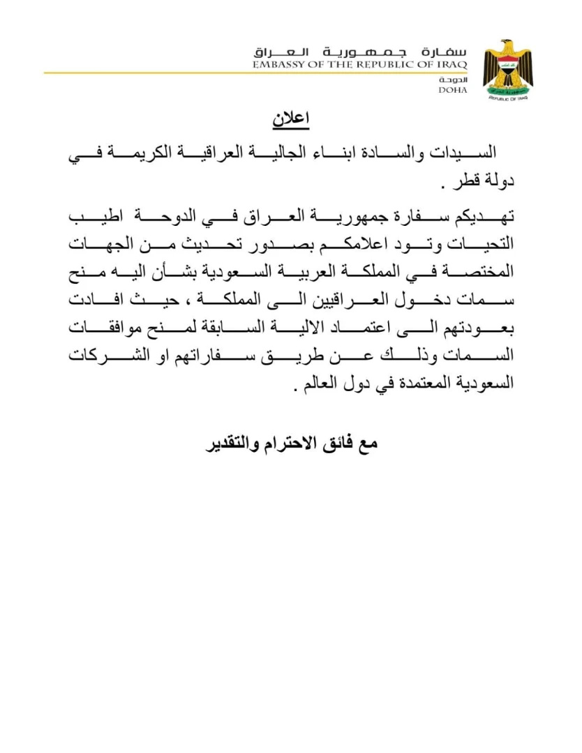 وذكرت السفارة في بيان موجّه إلى الجالية العراقية في قطر، أنها تلقت إشعاراً يفيد بأن منح سمات الدخول إلى السعودية سيجري مجدداً عبر السفارات السعودية أو من خلال الشركات المعتمدة في مختلف دول العالم.