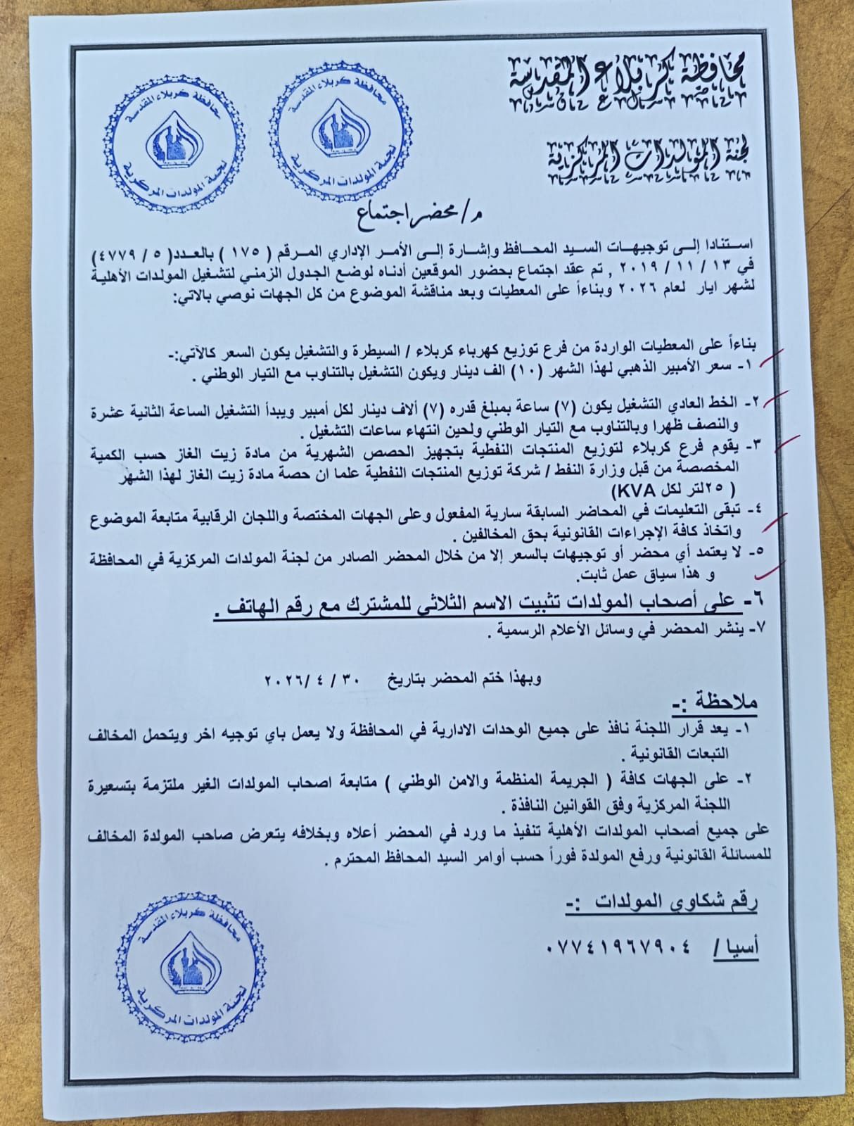كربلاء تحدد تسعيرة امبيرية المولدات الاهلية لشهر ايار القادم (وثيقة)